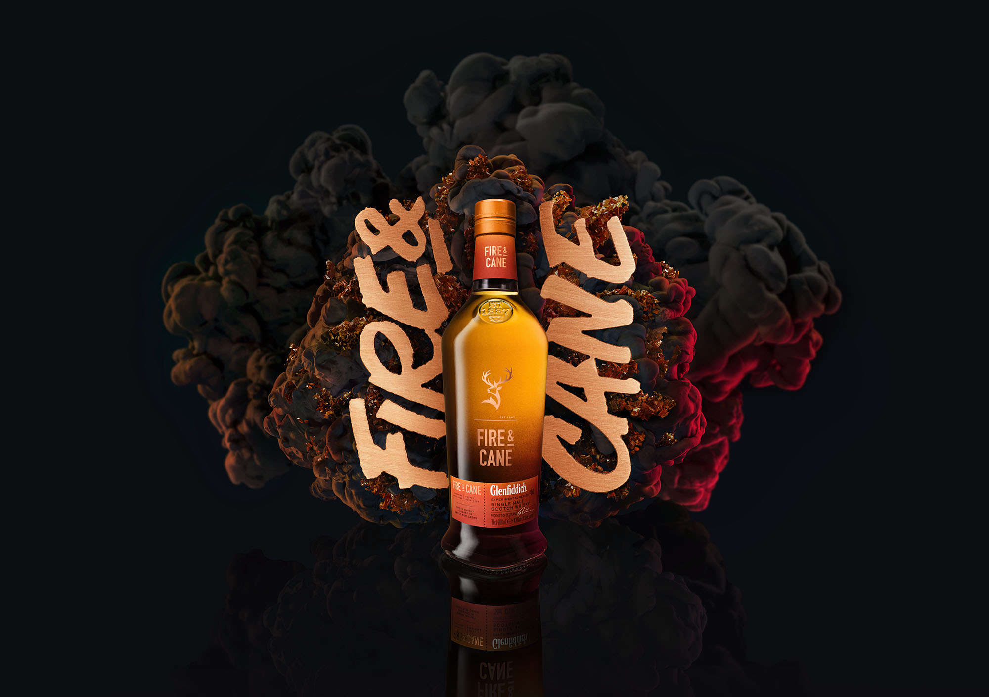 The TV commercial works backwards through beautiful close-ups and special effects that end in the ‘unexpected spark’ from where Glenfiddich Fire & Cane whisky was born. It shows reverse slow motion shots of underwater smoke depicting the essence of campfire smokiness, while sugar crystallisation illustrates the toffee sweetness of the whisky. The social media content includes more stunning shots of the elements that make up Fire & Cane Whisky, while the main poster emphasizes the boldness at the core of the campaign.