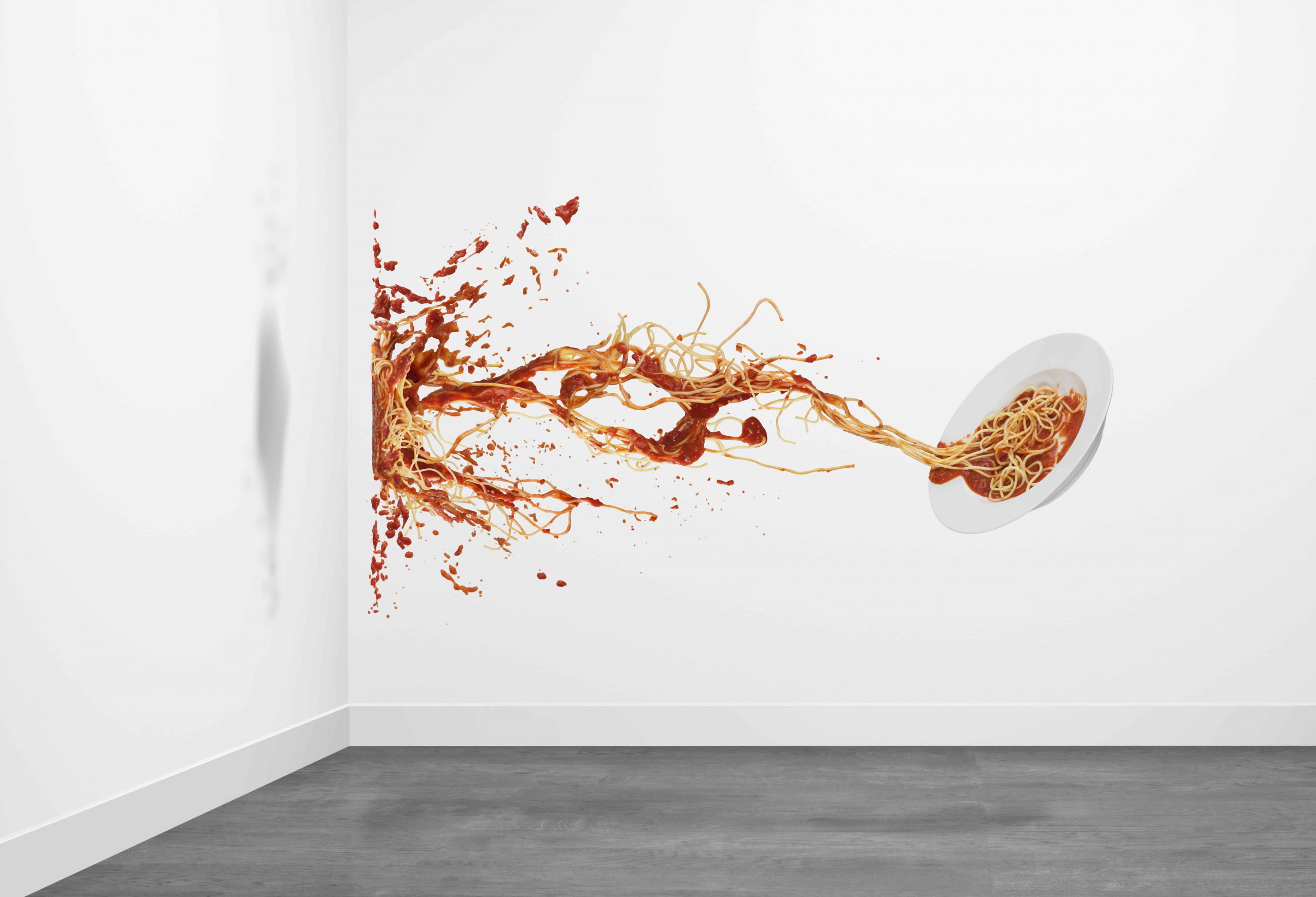 Using foods known to cause tough stains and shooting them flying through the air, we set about making a mess. The television commercial shows each food splashing onto a white wall one by one, before the painter and decorator walks in and wipes it all off with ease. The demo sequences in the film are real — this paint really works! For the print campaign, the effect of the ‘Stain Shield’ paint formula is dramatised visually with a force-field repelling the flying stain before it reaches the wall.
