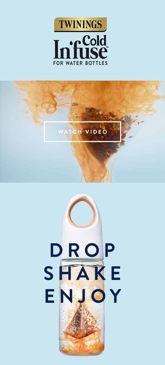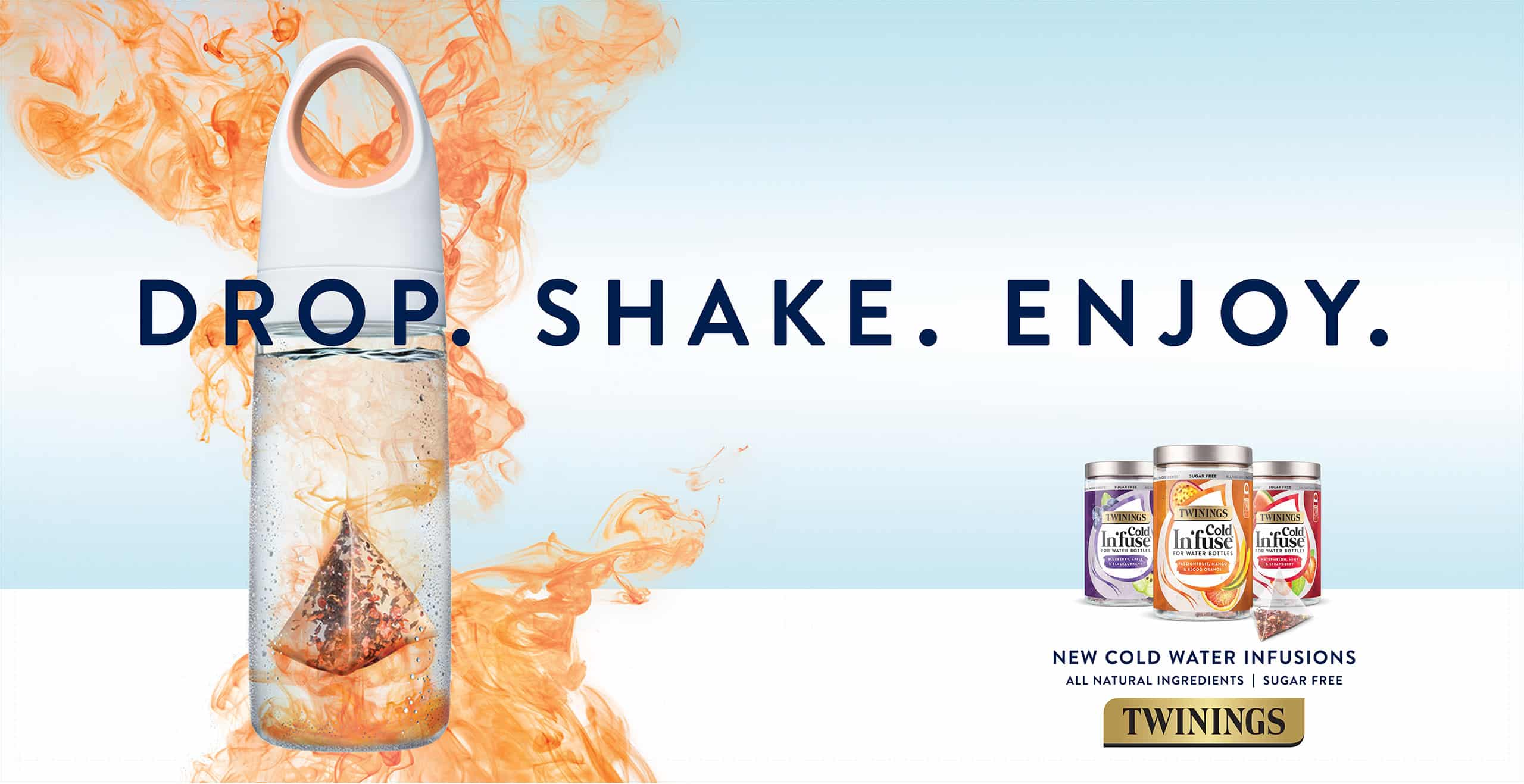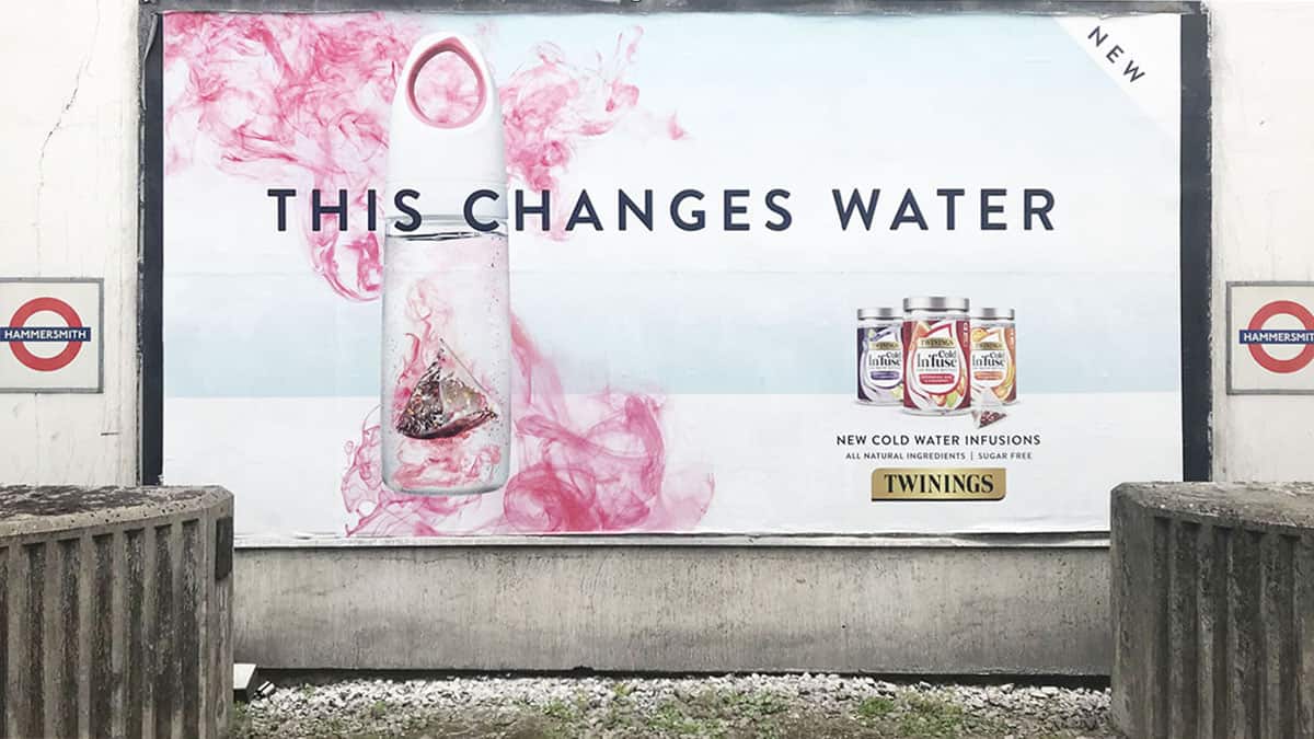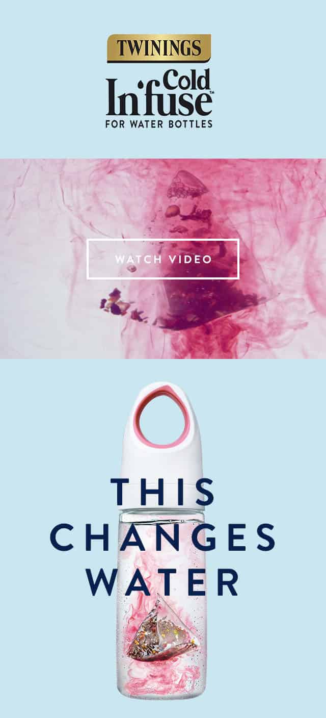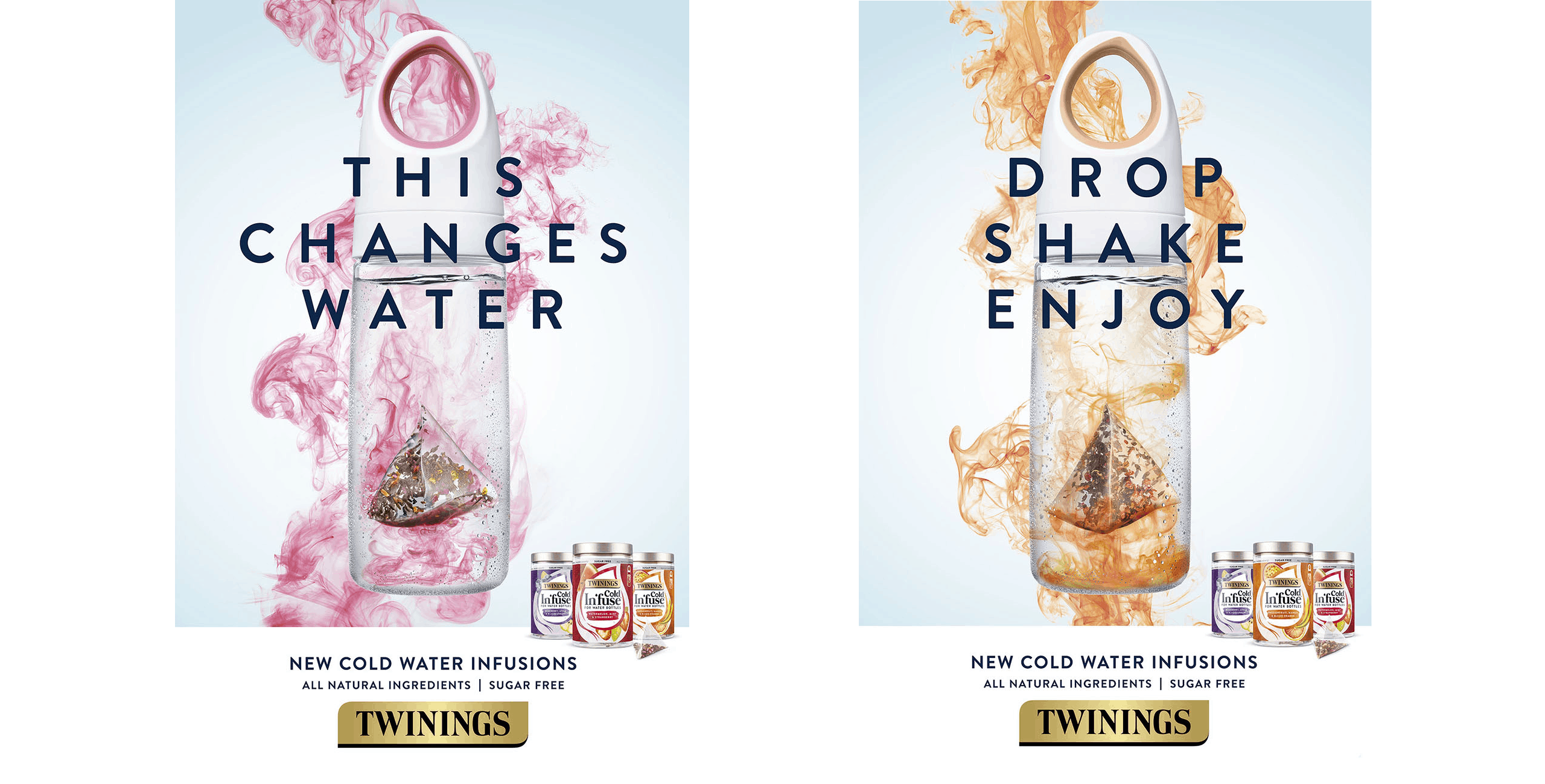 The creative idea shows the infusion of colourful flavours emerging from the infuser inside a water bottle. The product lends itself to beautiful still images and slow motion film shots of the natural flavouring spreading through water. True to the tagline “This Changes Water”, Twinings Cold In’fuse and its accompanying campaign altered perspectives of flavoured water. After its initial success, the campaign was used for television commercials in the UK.