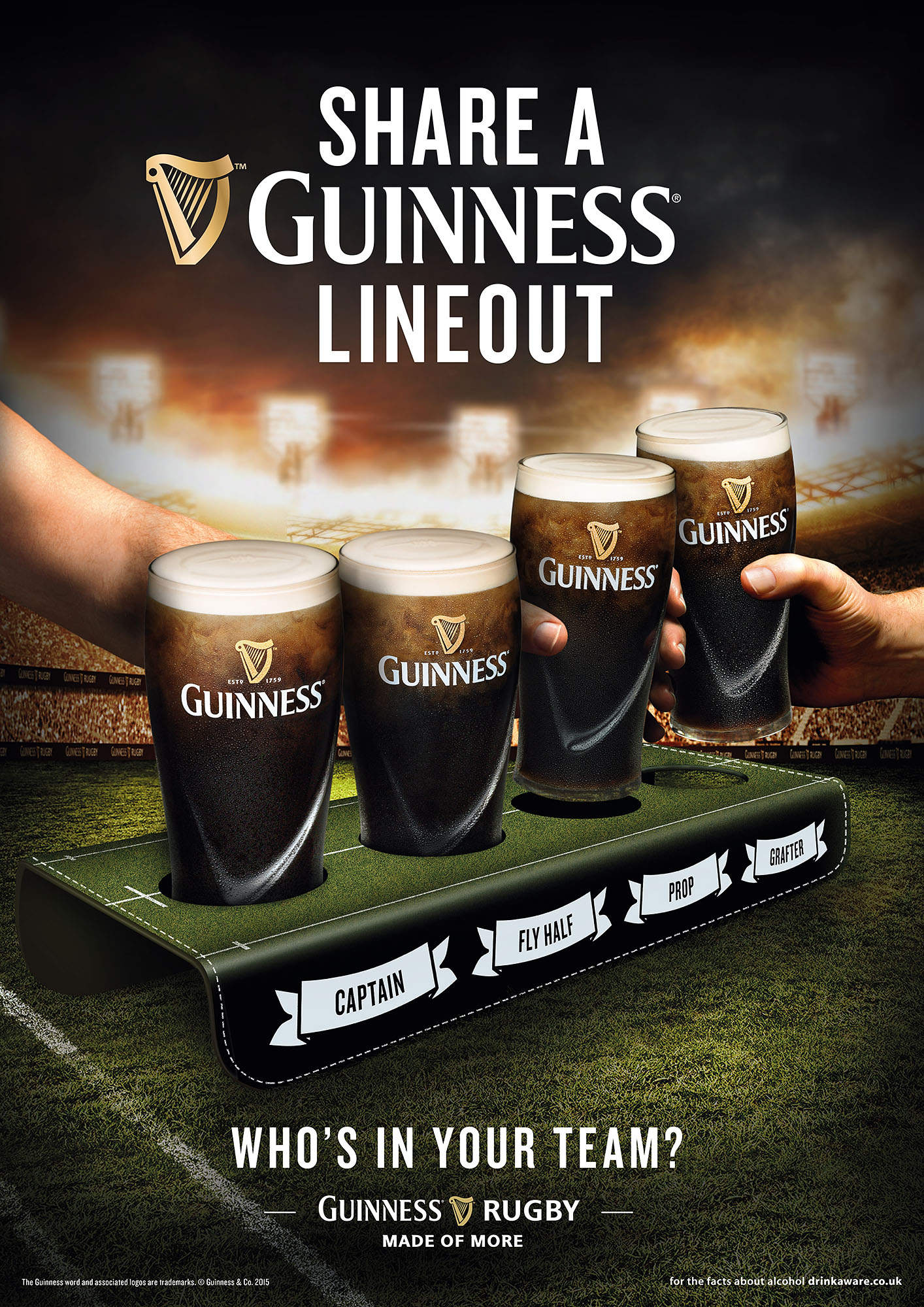 A series of Guinness rugby advertising visuals created for their World Cup promotion. Shot in-camera using an illustrated stadium background with real dynamic liquids, this project brought together pint-perfect drinks photography, lifestyle elements, and brand campaign imagery for Guinness’s partnership with rugby.