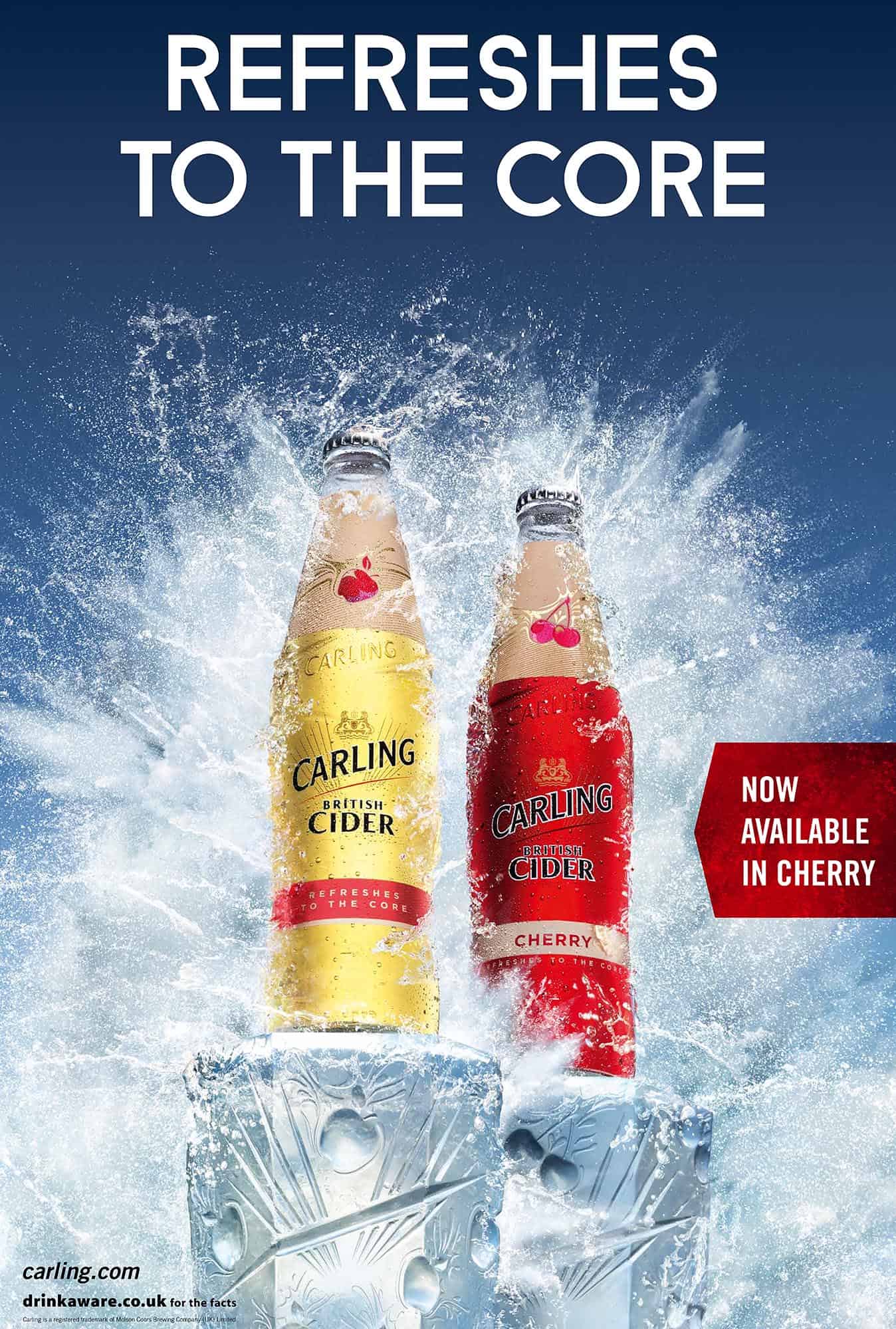 In this OOH campaign, Carling British Cider commissioned Jonathan Knowles to illustrate the refreshing nature of Carling Cider by shooting it in a freezing cold and icy environment. The bottle of cider sits atop a carved ice column surrounded by icy splashes.