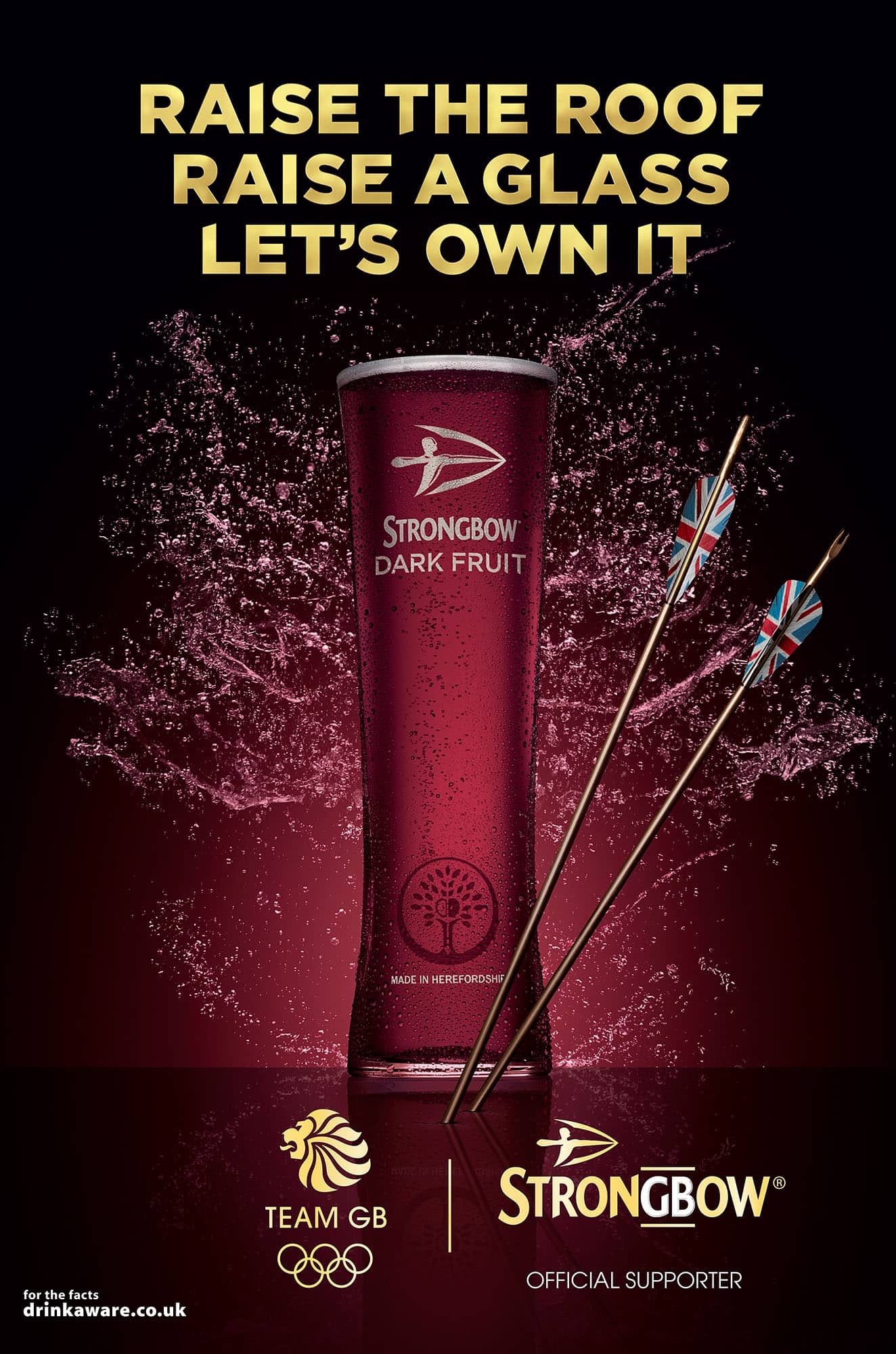 A bold cider advertising image shot for Strongbow’s partnership with Team GB. Featuring their Dark Fruit, Original, and Cloudy Apple ciders captured mid-splash, this drinks campaign combined precise beverage photography with high-impact visuals for a national sponsorship campaign.