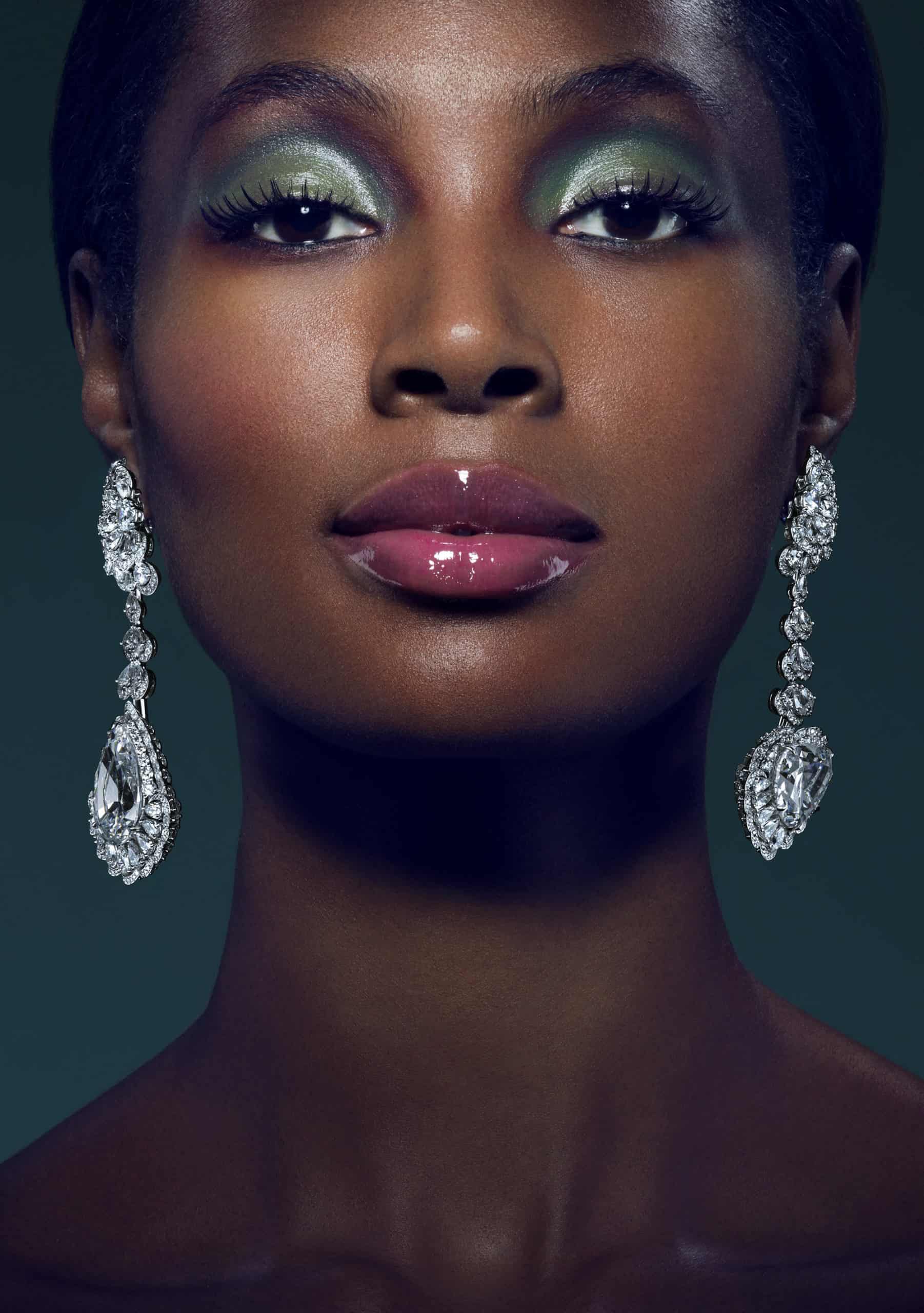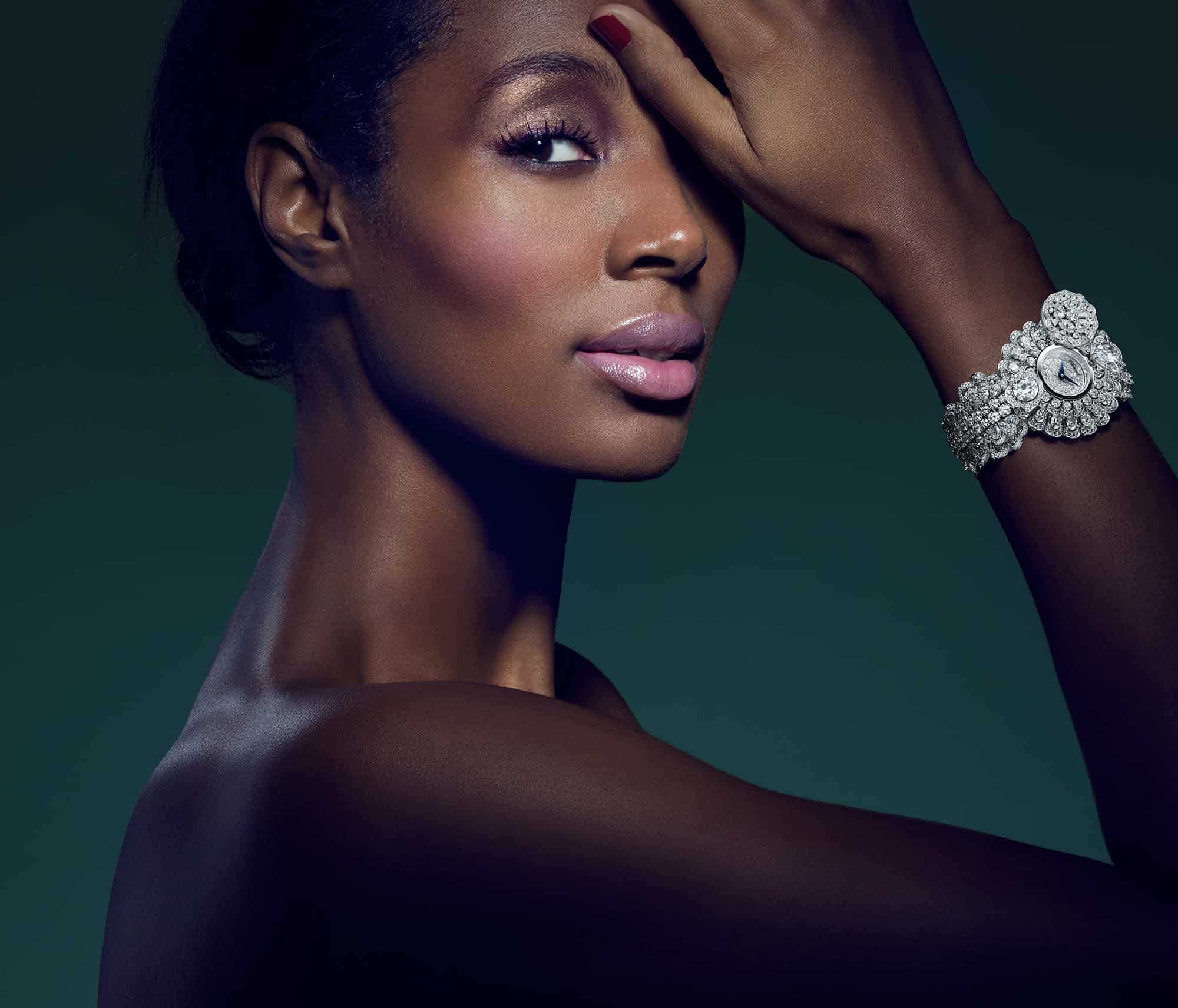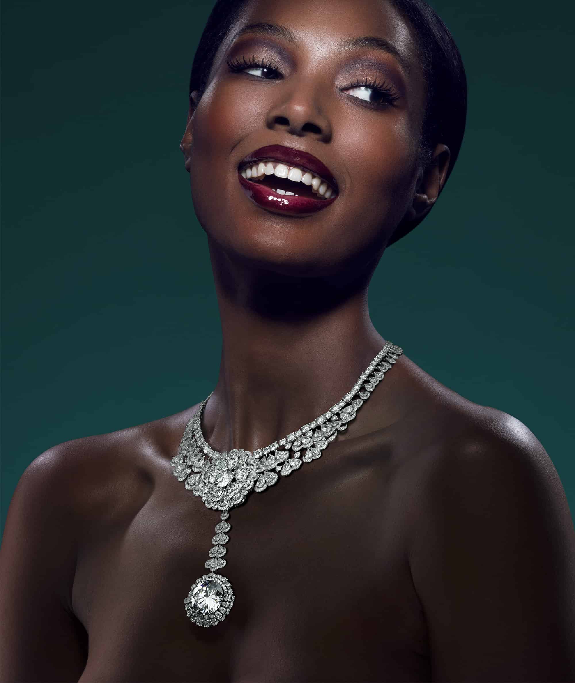 This series of images was shot to advertise a line of Chopard jewellery. The main necklace, rings, earrings and watch make up the suite called Garden of Kalahari. The model in the photographs represents the Queen of Kalahari; the name also given to the diamond that was discovered in South Africa, and is the largest diamond ever found with that purity of colour and clarity.