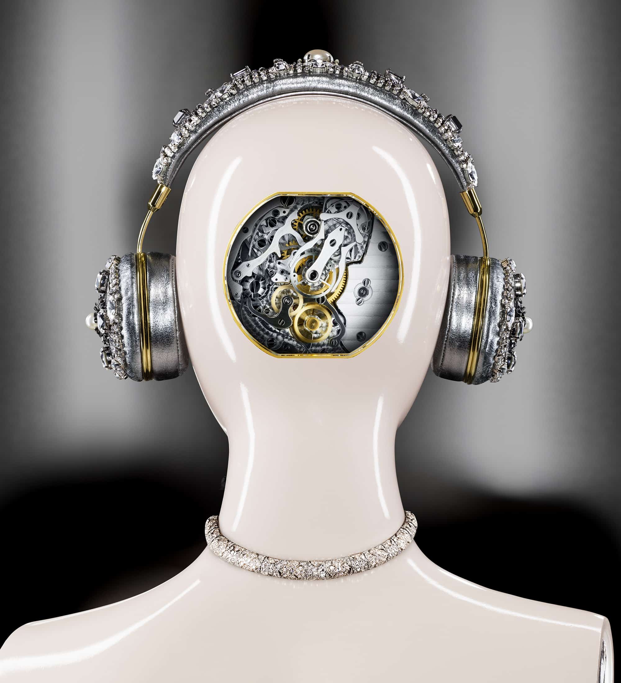 For a technology issue of a magazine, Dolce & Gabbana wanted a robotic beauty look. Jonathan shot these images with a shiny and plastic feel. The metallic headphones were designed by Dolce & Gabbana, and the jewellery by Bulgari.