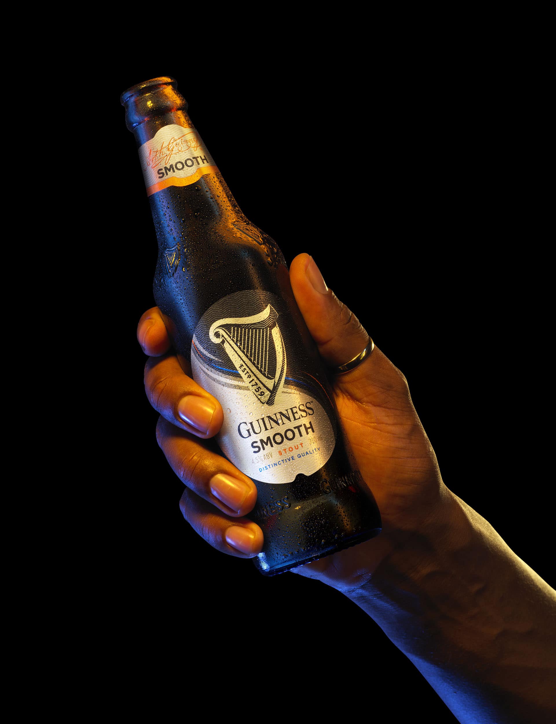 An intimate set of images capturing the distinctive character of Guinness bottles in hand. Lit with sculptural precision to accentuate the cold condensation, rich tones, and iconic branding, each shot evokes immediacy and presence – from the smooth refreshment of Guinness Smooth to the confident intensity of Foreign Extra Stout. These images celebrate the tactile, human connection with the product, transforming each hold into an expressive brand gesture and were lit to integrate with scenes shot in Nigeria for an African OOH campaign.