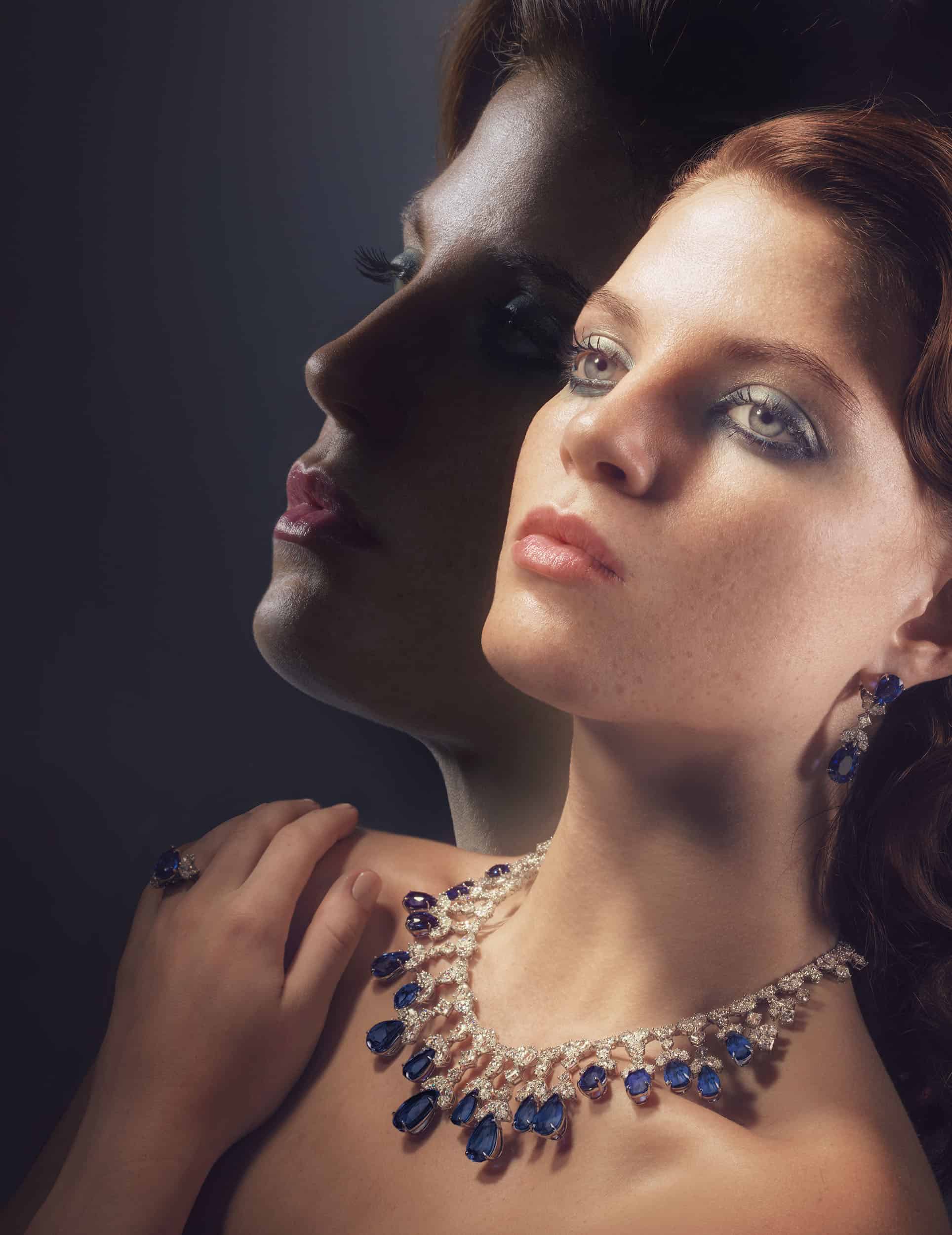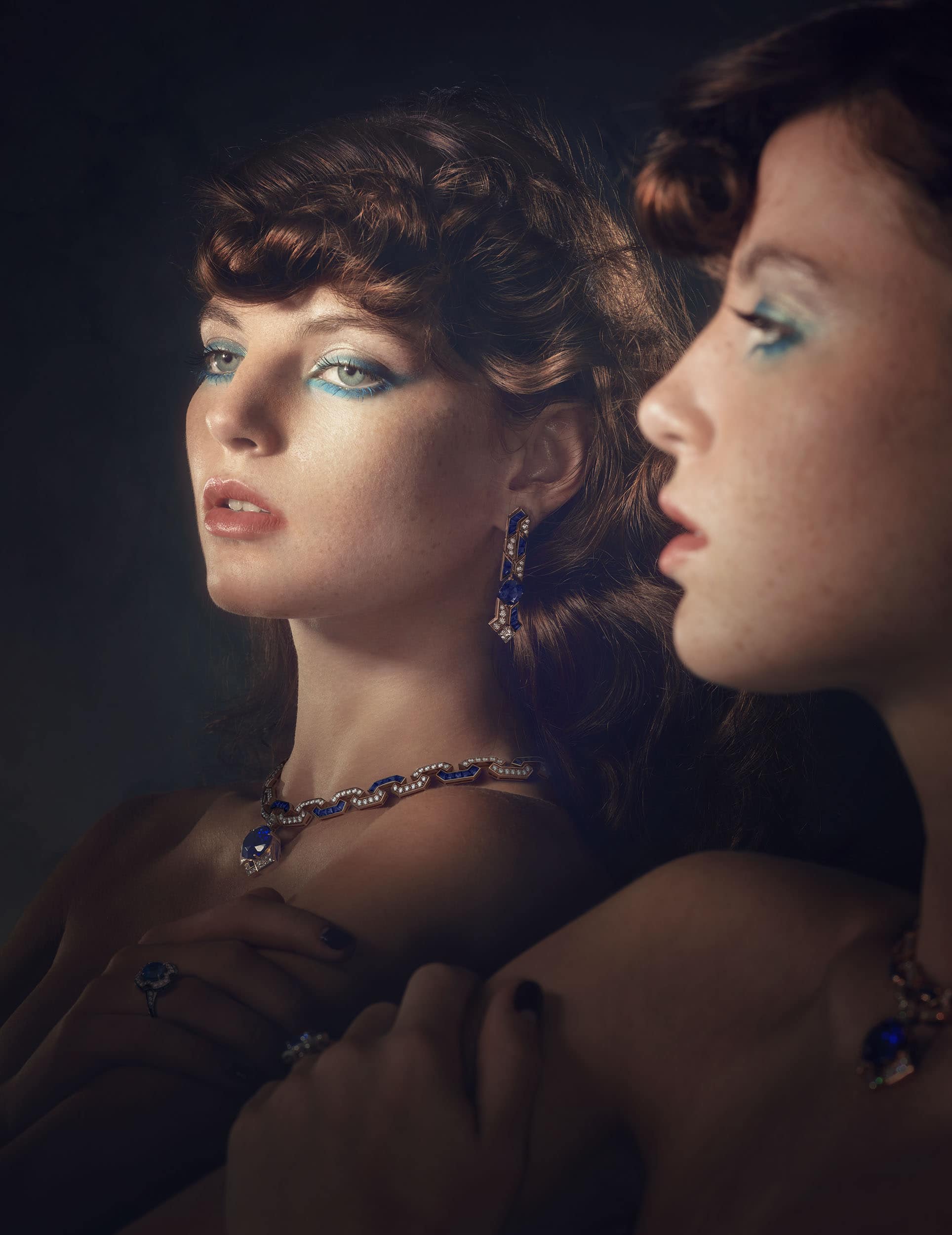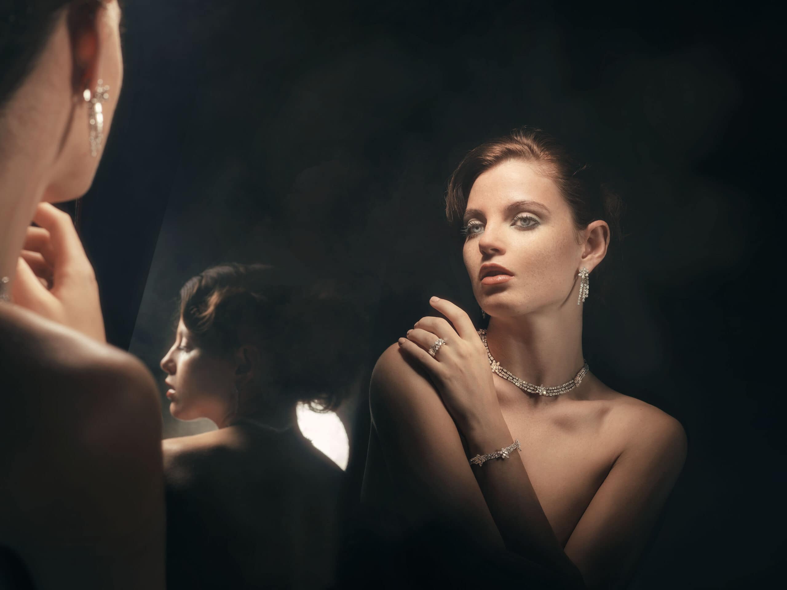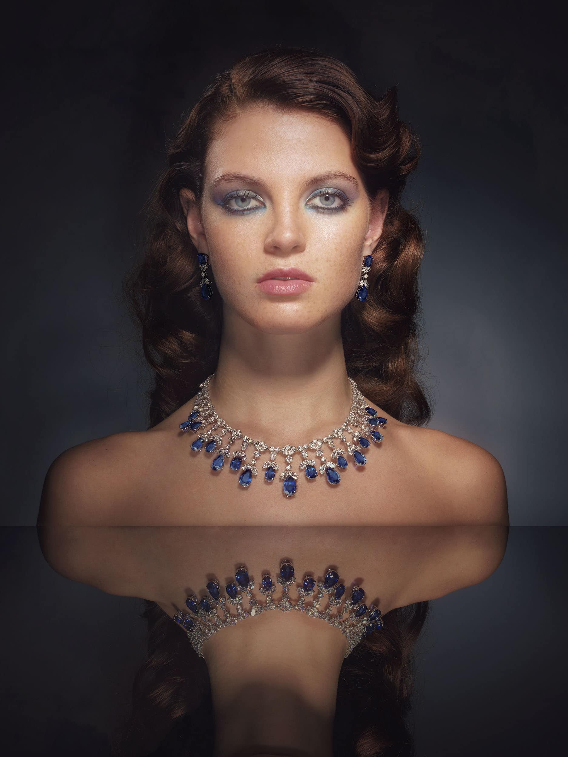 Using mirrors, the model is captured wearing the beautiful jewellery in reality and in reflection simultaneously.