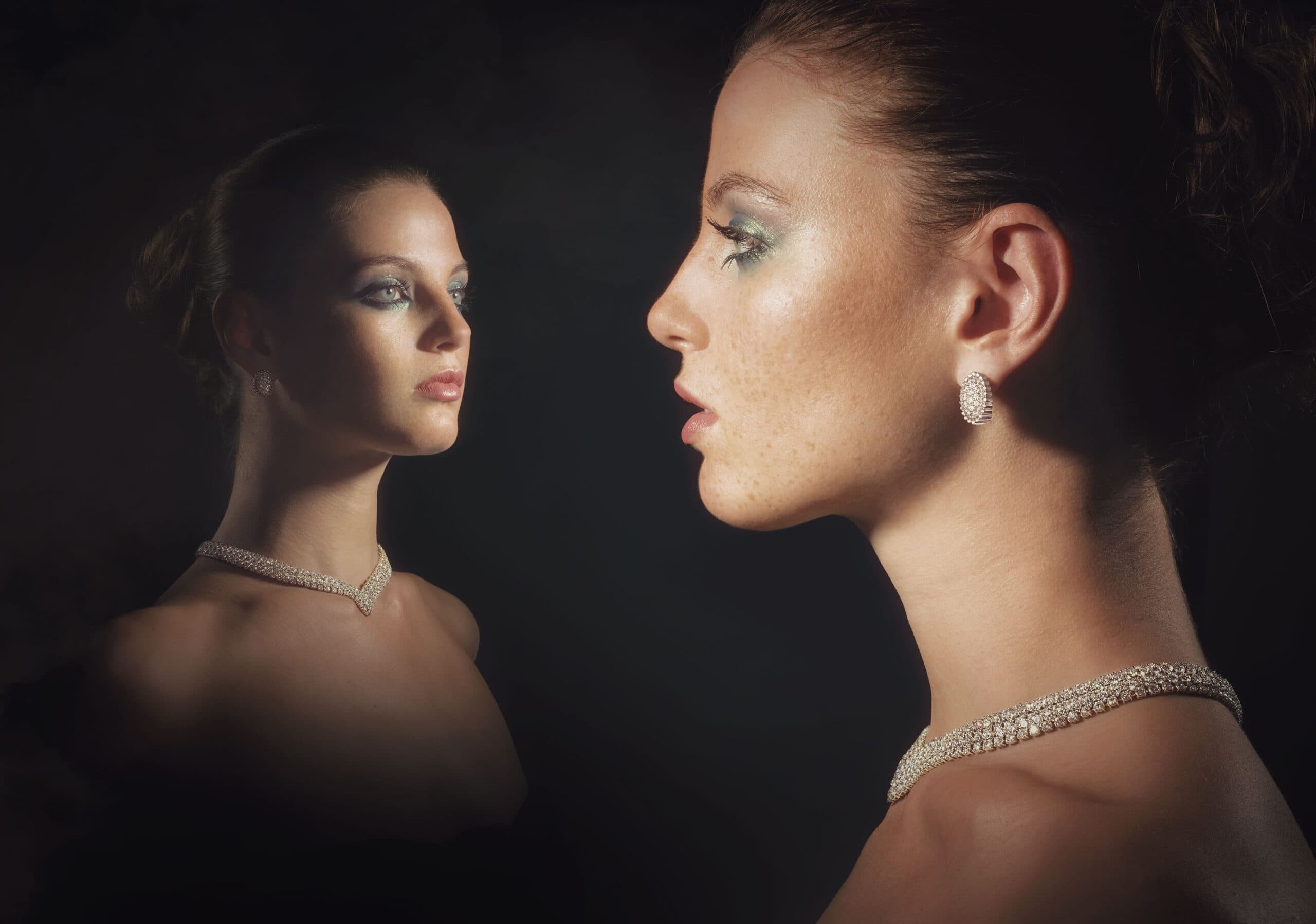 Using mirrors, the model is captured wearing the beautiful jewellery in reality and in reflection simultaneously.