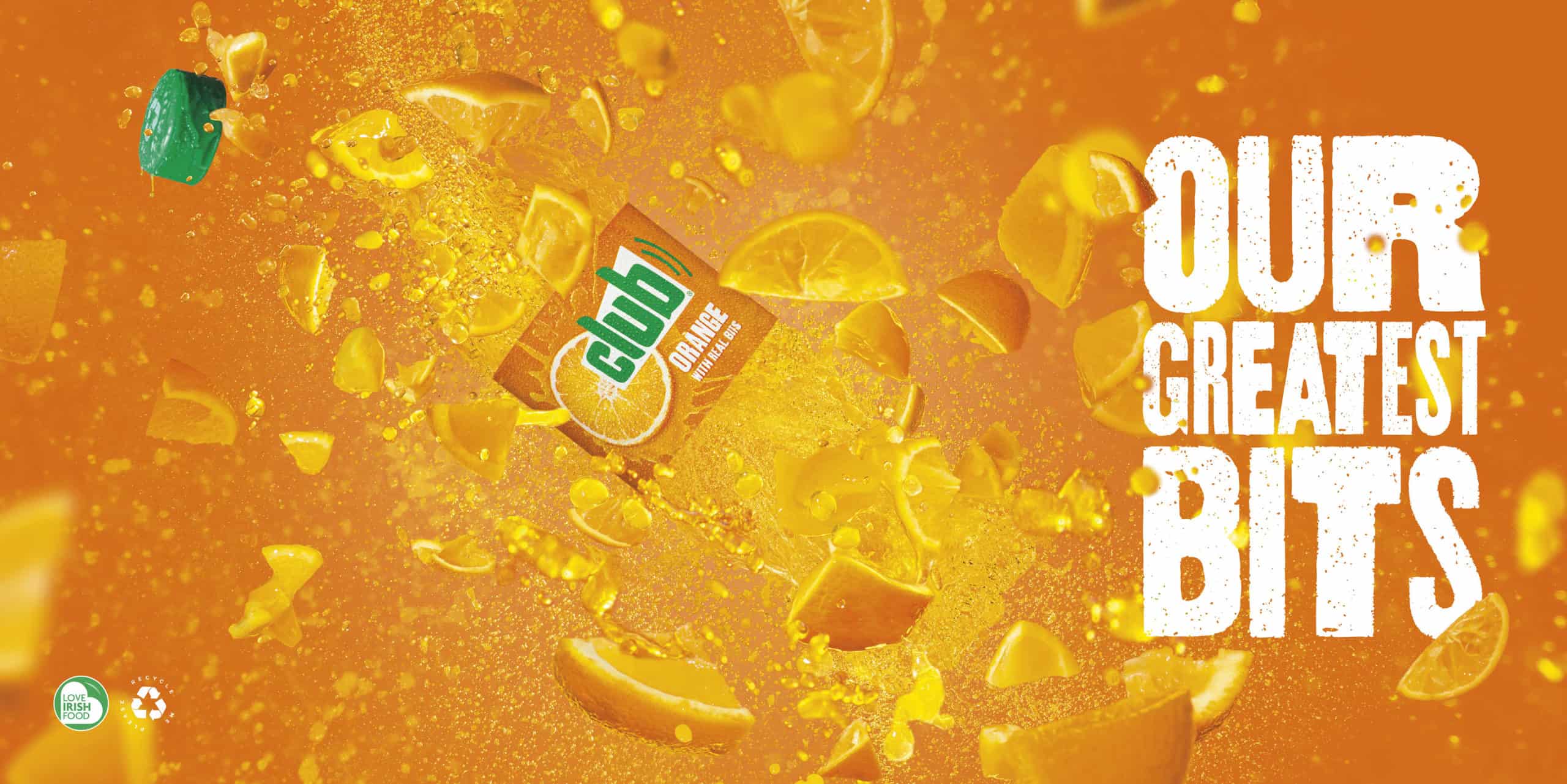 A summer campaign for Britvic Ireland’s soft drinks brand, Club Orange, commissioned by Oliver Dublin.  We photographed a hero image that creates all the taste and refreshment cues that are crucial to the drinks category. The image suggests an explosion of flavour using a combination of liquid and orange pieces exploding outward from the epicentre whilst capturing the shape of the bottle.