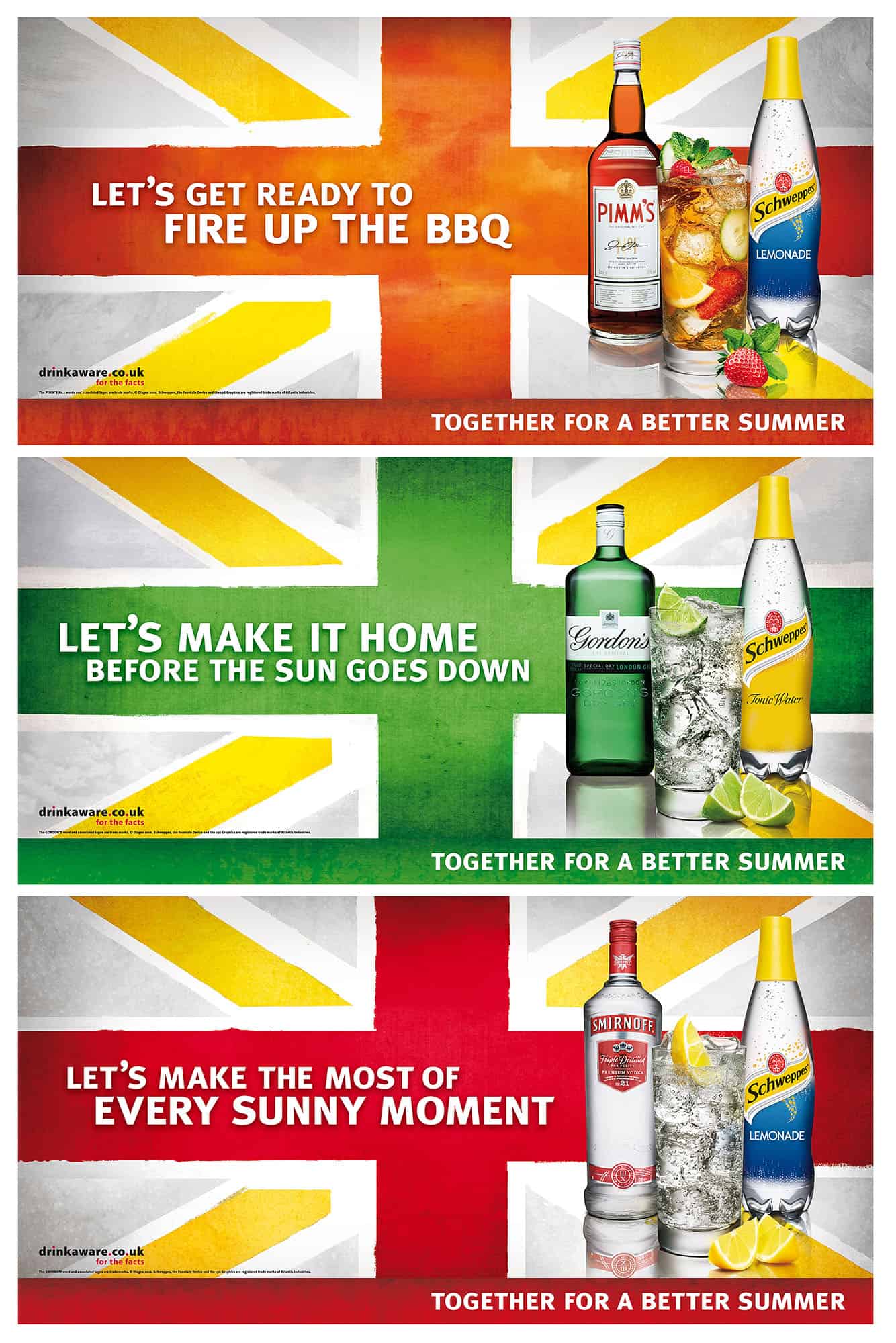 Here are some thirst quenching new drinks images for Diageo and Schweppes summer campaign. We shot Pimm’s, Smirnoff Vodka and Gordon’s Gin spirits with Tonic, Lemonade & Cola mixers. The flags give it a great British summer feel. All we need to do now is sit back and wait for the sun to start shining! With over 2000 poster sites, it should be up somewhere near you.