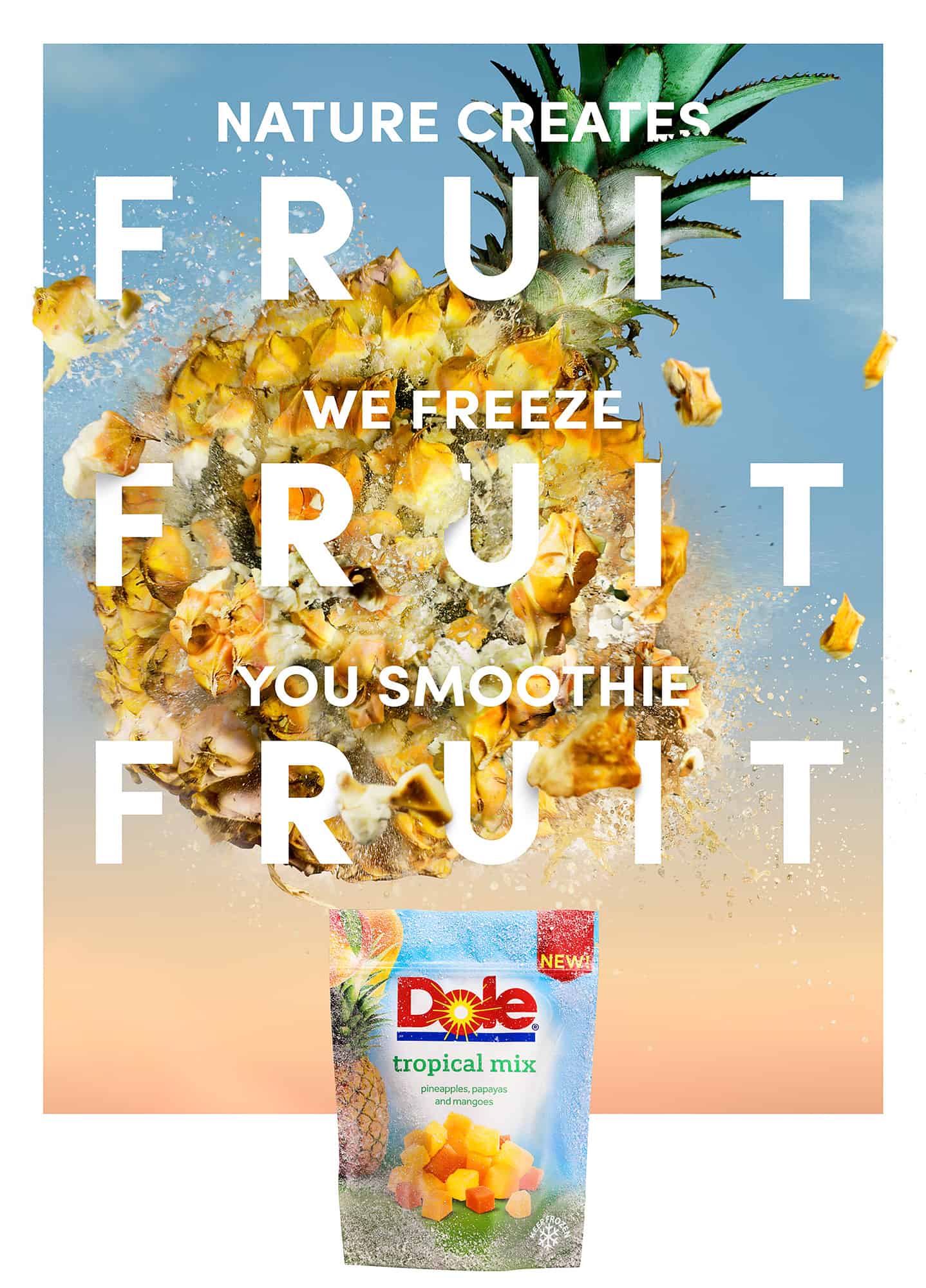 We all had a blast shooting a new advertisement for Dole’s frozen fruit range in collaboration with Art Director Misha Newby and Creative Director Mark Elwood at 101 London. Embracing his mischievous inner child, Jonathan created juicy explosions in the studio resulting in an energetic and lively campaign. Although we are still finding bits of pineapple around the studio…
