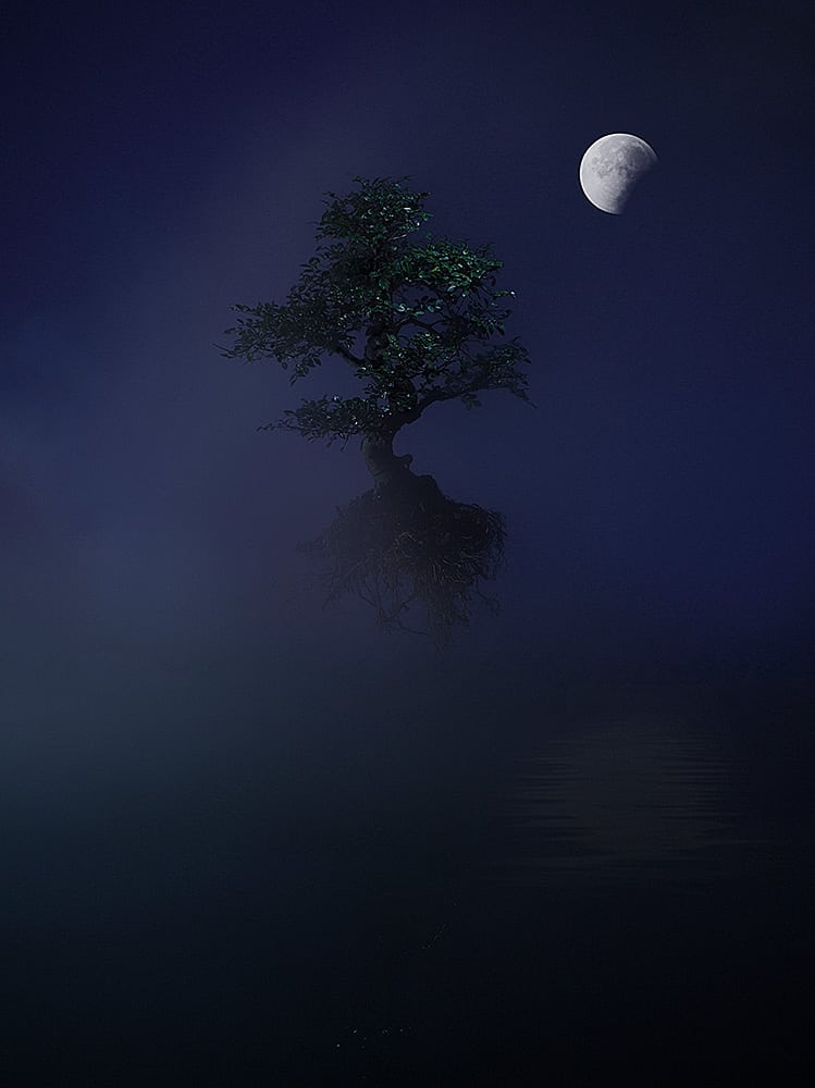 A still life project working with set designer William Farr, looking at the different times of day and how the light interacts with a floating bonsai tree.