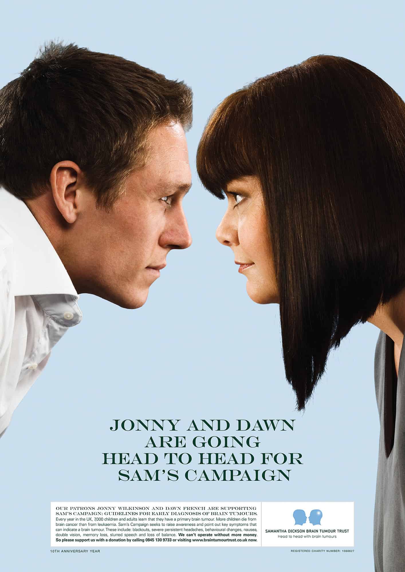 During February, Jonathan has photographed Jonny Wilkinson, Dawn French, Earl Spencer and Fiona Fullerton in support of The Samantha Dickson Brain Tumour Trust, now the number one fundraising charity for brain tumour research in the UK. The advertisements feature the celebrities ‘head to head’ in the style of Smith and Jones, mimicking the charity’s corporate identity.